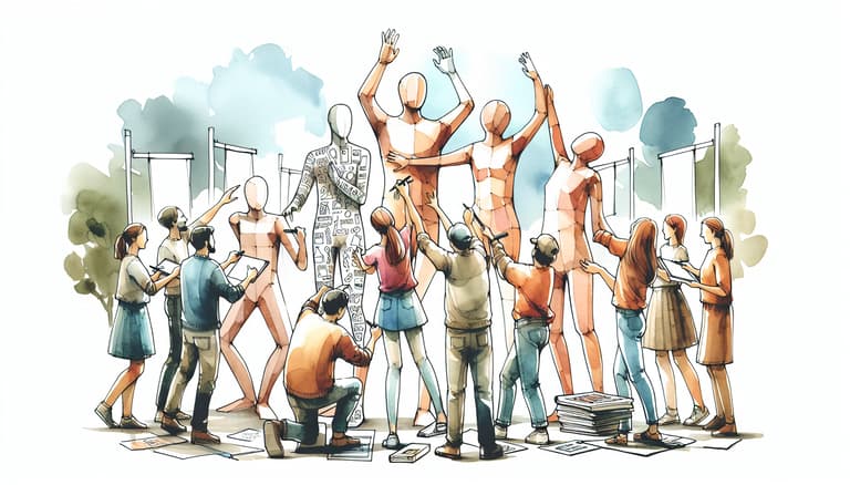 - Create a human sculpture: Using their bodies, each group creates a physical representation of their chosen concept. Every member should be part of the overall sculpture.
